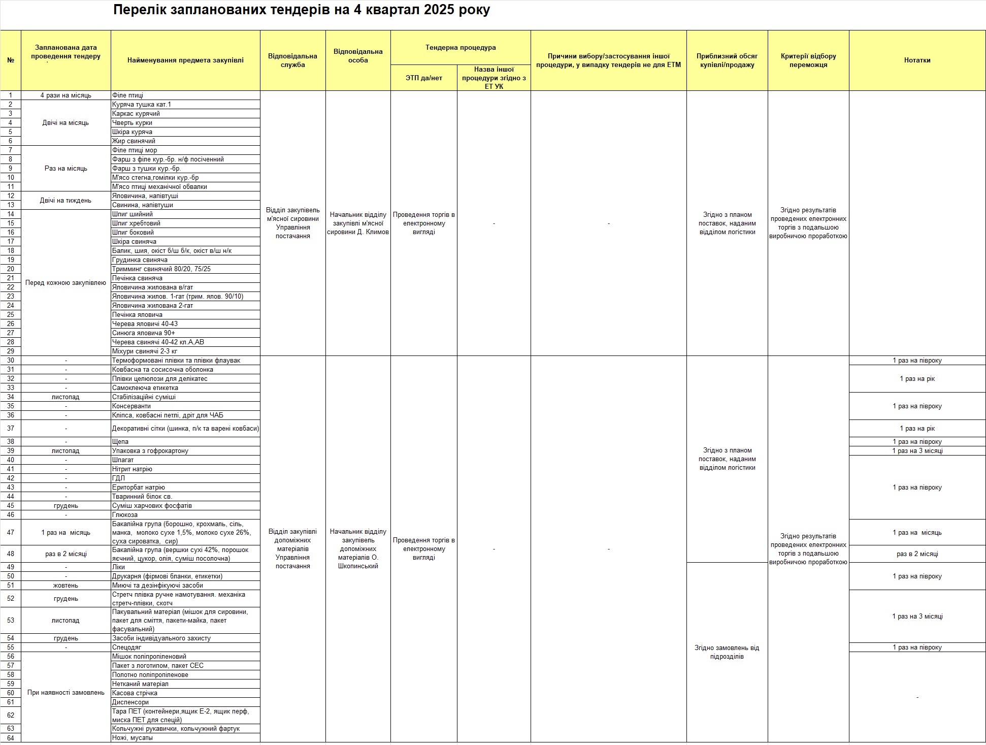 План проведения тендеров